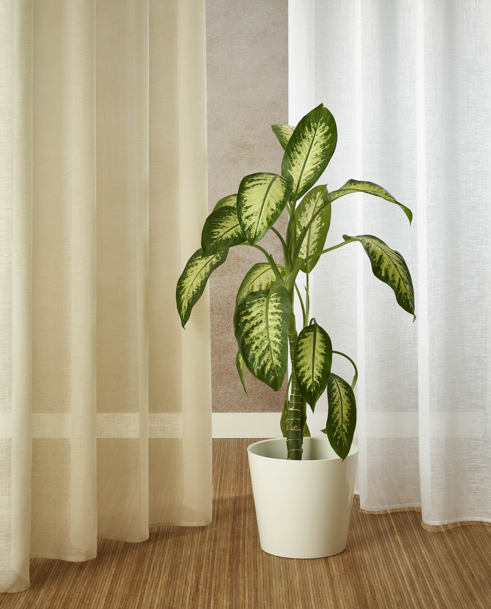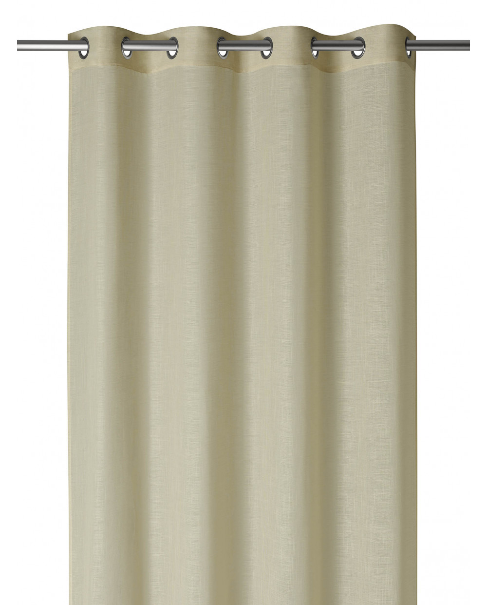 Visillo textil fabricado en poliéster al 100%. Presenta unas dimensiones de 140x265 cm y está acabado con ollaos.